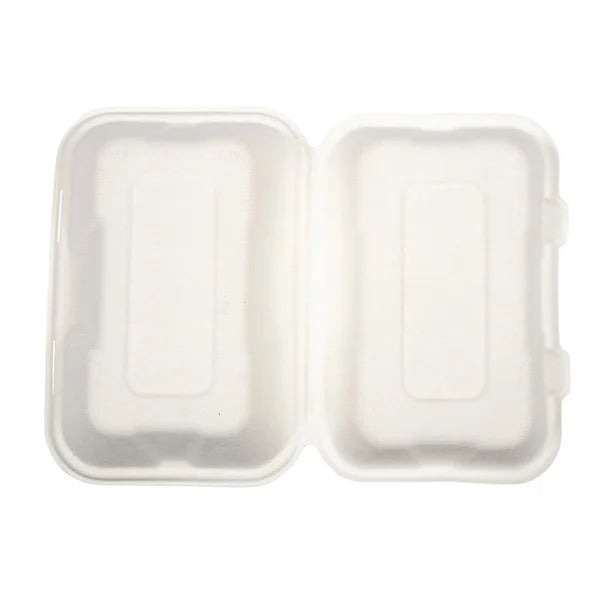 Vegware Compostable Bagasse Clamshell Hinged Meal Boxes 228mm 228(W) x 155(D)mm | 9 x 6". Pack Quantity: 200