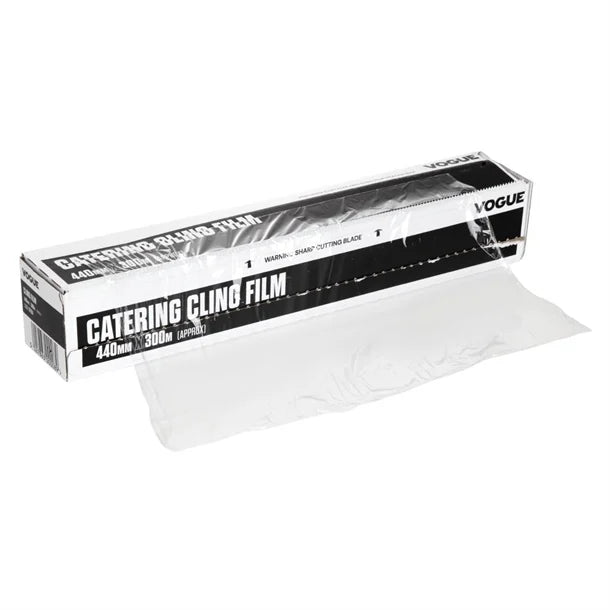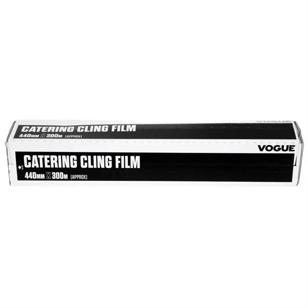 Vogue's heavy-duty cling film covers, protects and preserves food, keeping it fresh whenever you need it. Perfect for busy caterers, this 440mm wide, 300m long roll comes packaged in a cardboard cutter box with serrated edge to cut the cling film to your desired length. Thanks to its extra-wide size it's perfect for covering larger trays and gastronorms. Plus, its strong plastic makes the film resistant to tearing or ripping.